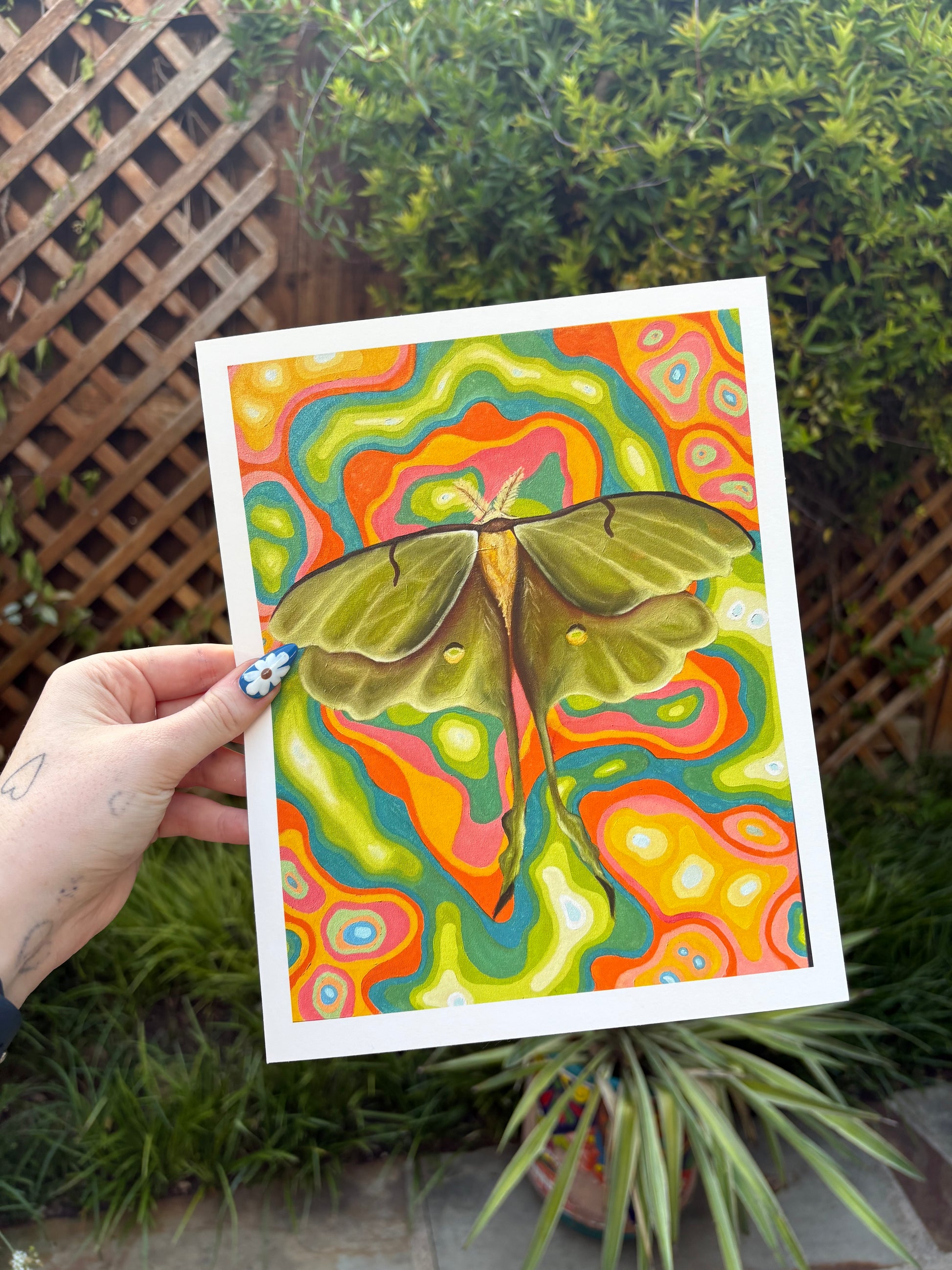 This art print is a print of an original oil painting by Erin Nicole. It depicts a vivid and saturated abstract background with a realistic Lunar Moth as the main subject.