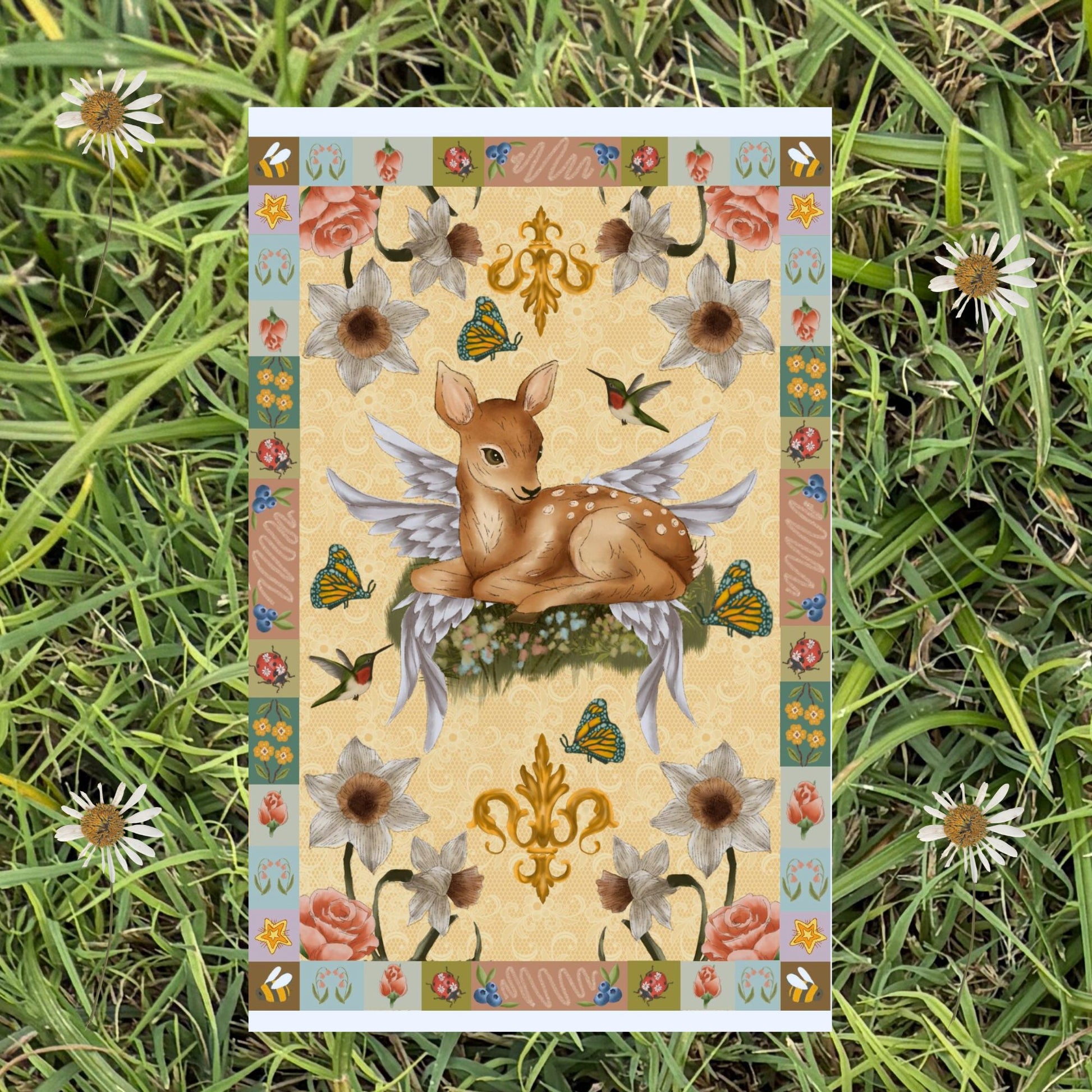 This art print is a print of an original digital drawing by Erin Nicole. It depicts folk art deer with angel wings, daffodils, butterflies and hummingbirds.