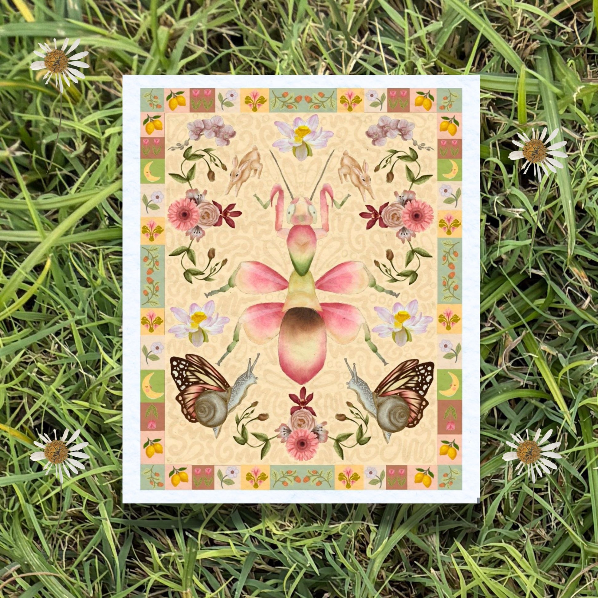 This art print is a print of an original digital drawing by Erin Nicole. It depicts an Orchid mantis, lotus flowers, fairy snails and floral elements. Prints are offered framed or unframed. Sizes available are 4x5, 8x10, 11x14 and 16x20 inches.