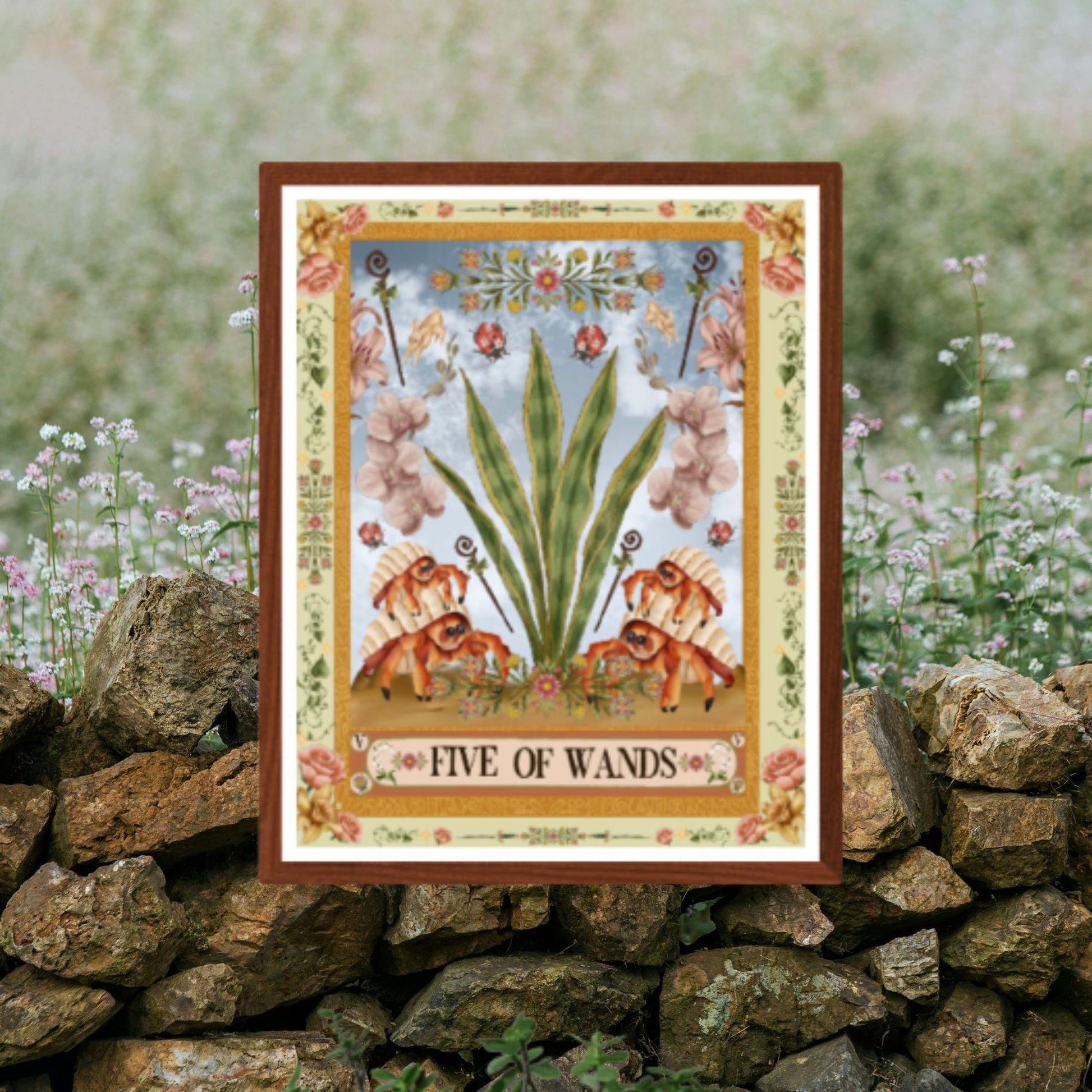 This art print is a print of an original digital drawing by Erin Nicole. It depicts The Five of Wands tarot card drawn in a folk art/cottage core art style.